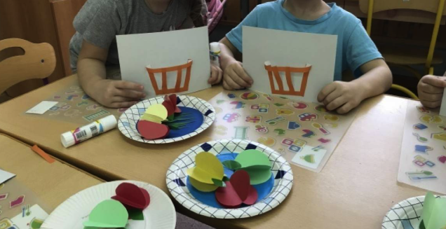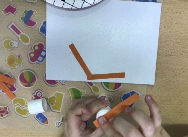 Potong potongan kecil kertas cokelat untuk ekornya dan tempelkan di atasnya. Daunnya terbuat dari kertas hijau - bentuk oval, Anda bisa menggambar urat.