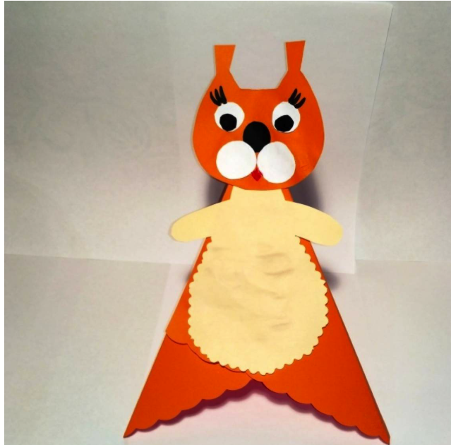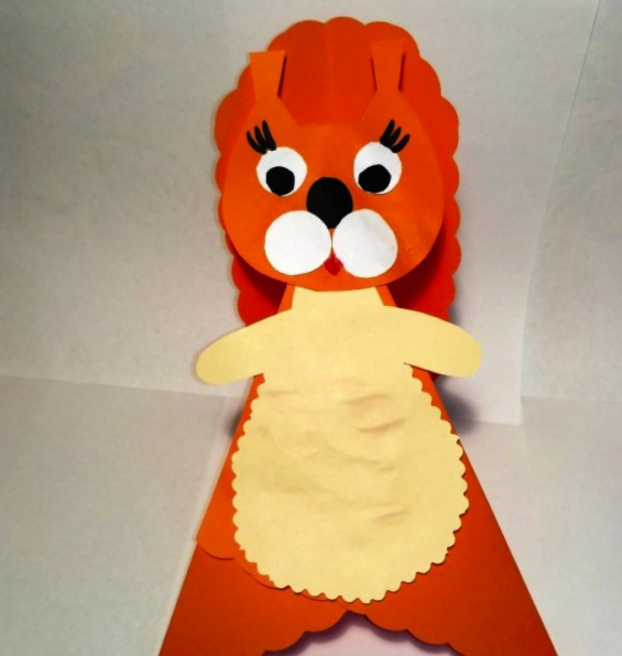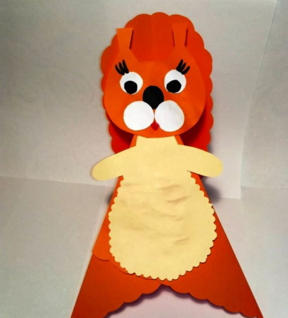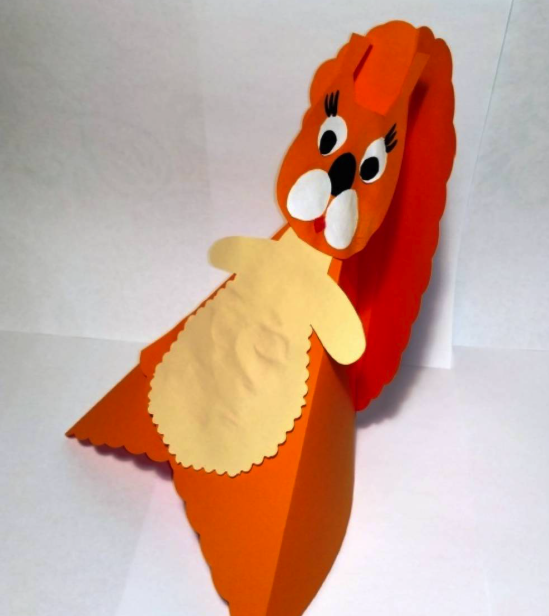 Белка собирается из простых форм — основу составляют цилиндры и овалы. С задачей справятся даже младшие школьники с минимальной помощью. Работать можно как с белой бумагой (и раскрашивать), так и с уже цветной.