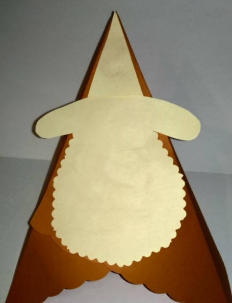 Теперь добавьте глазки: можно вырезать кружочки из белой бумаги и нарисовать чёрные зрачки, либо использовать готовые декоративные глазки. Для носа подойдёт маленький кружок из чёрной бумаги. Ушки — это два маленьких треугольника, приклеенных по бокам головы.