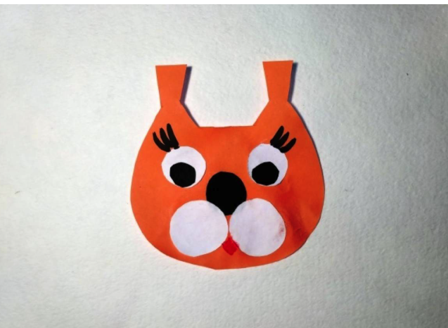 Из той же бумаги вырежьте овал или круг — это будет голова белки. Слегка согните по центру и подклейте к верху туловища. Чтобы придать объём, можно склеить два одинаковых овала, вложив между ними полоску бумаги — получится не просто круг, а каплевидная объёмная форма.