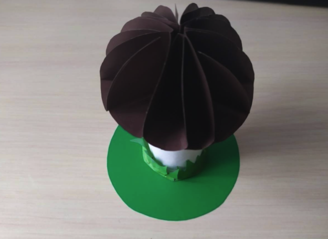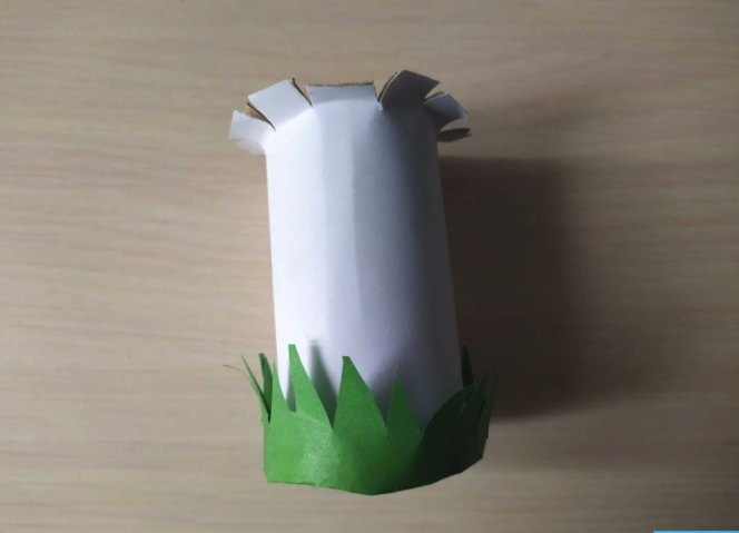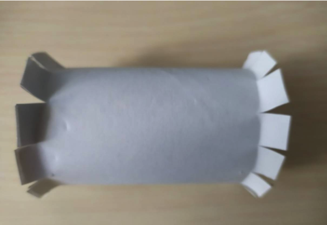 Для ножки берём светлый лист бумаги и вырезаем прямоугольник размером примерно 10×15 см. Скручиваем его в плотную трубочку и склеиваем по боковому шву. Нижний край немного сплющиваем и надрезаем на 4–6 полосок, затем загибаем их наружу — это нужно, чтобы приклеить ножку к подставке.