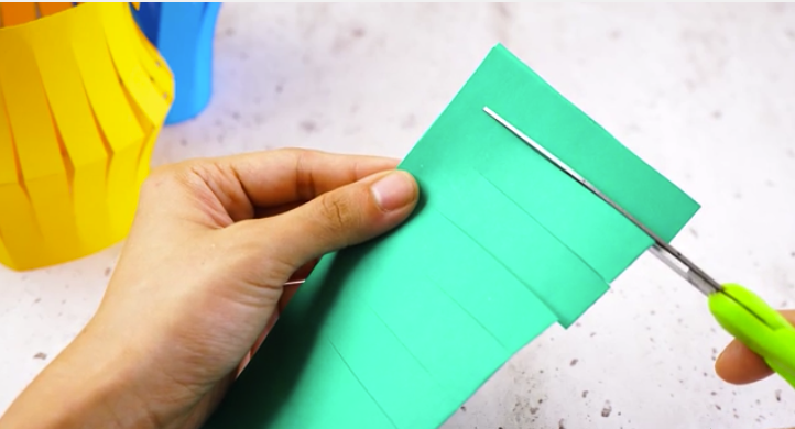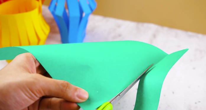 Берём лист бумаги формата А4 (например, зеленого цвета) и складываем его пополам вдоль длинной стороны. Не прорезая край сгиба, делаем параллельные надрезы по направлению к нему, не доходя 2 см до конца. Ширина полосок — около 1–1,5 см.