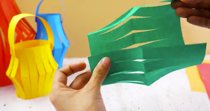 Когда весь лист будет прорезан, аккуратно разверните его и согните в цилиндр — полоски придадут изделию характерный «фонариковый» объём. Склейте или скрепите края — получилась внешняя оболочка.