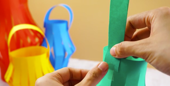 Остался последний элемент — ручка. Вырежьте полоску шириной около 2 см, длиной 18–20 см. Приклейте её к верхним краям фонарика. Если вы планируете подвешивать изделие — зафиксируйте особенно надёжно.