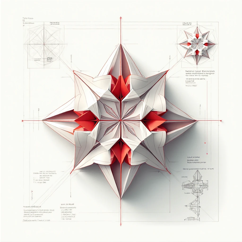 Схема сложной модели оригами с отметками мест, где сходится максимальное количество слоев бумаги — эти точки выделены красным цветом