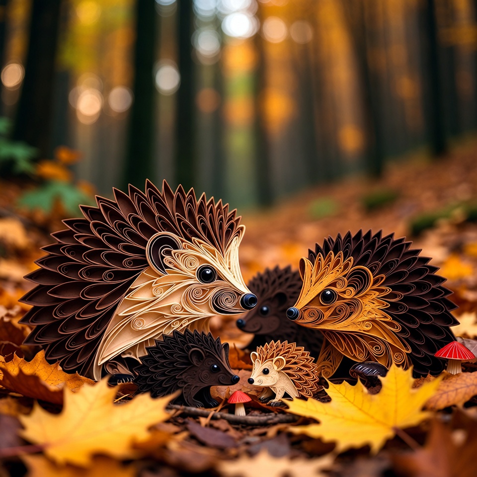 Готовая композиция: семья бумажных ёжиков в технике квиллинг разного размера в осеннем лесу