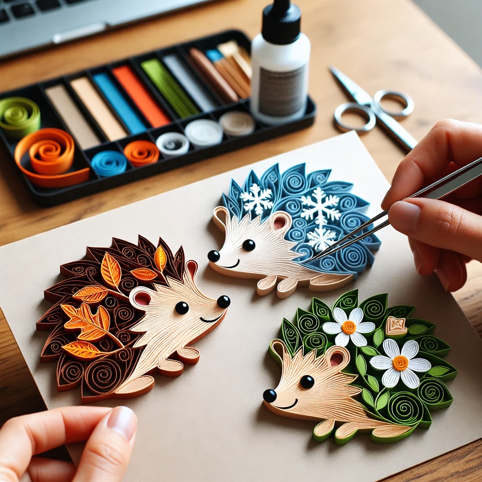 Серия ёжиков в технике квиллинг в разных сезонных образах: с осенними листьями, зимним снежком, весенними цветами