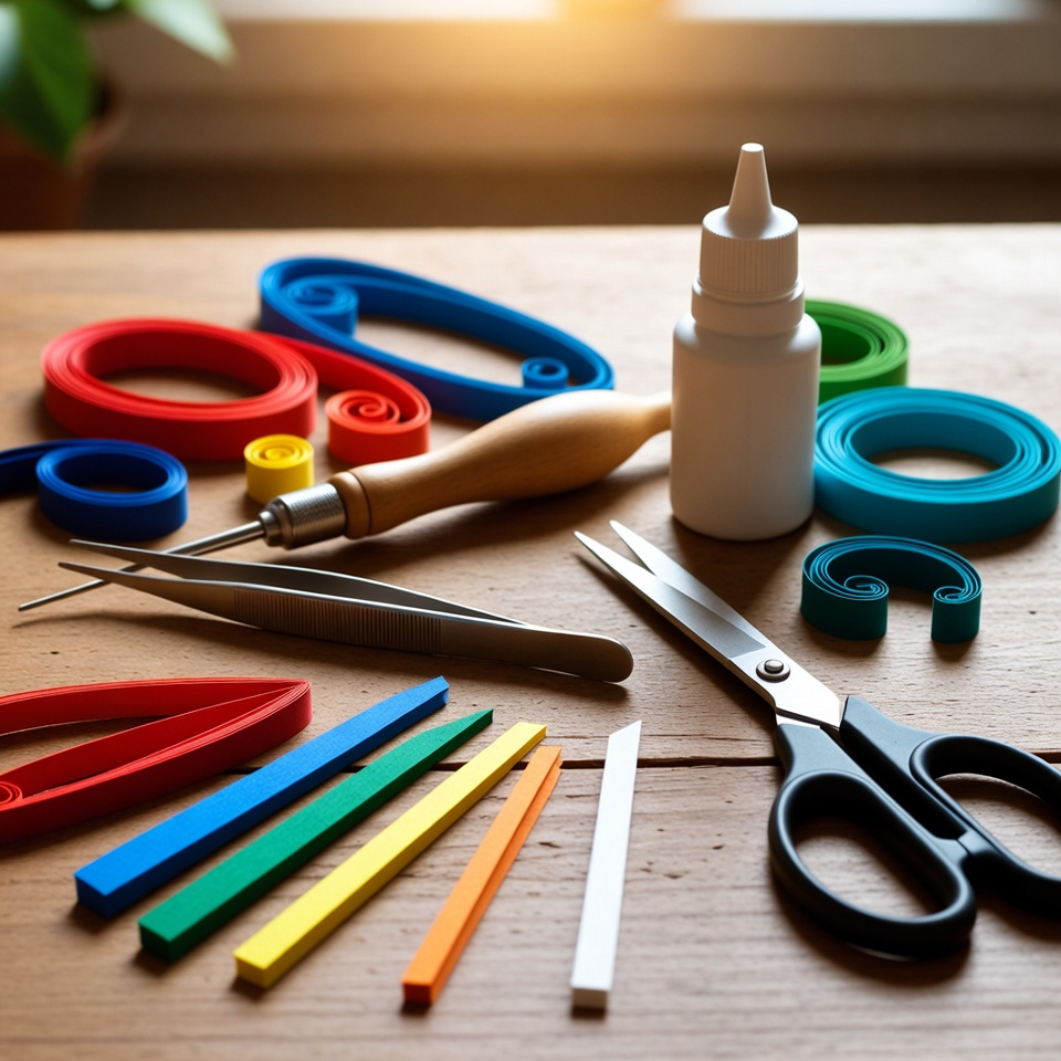 Набор материалов для квиллинга: разноцветные бумажные полосы, инструмент для скручивания, пинцет, клей, ножницы